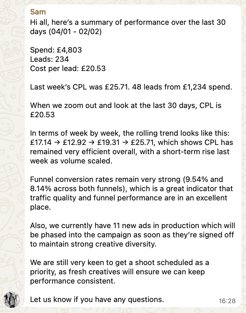 You'll receive a check-in every Monday with performance data via WhatsApp and be able to book in to speak with Joe on a monthly basis to dive deeper into performance and campaign strategy.
